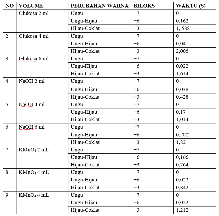 - Semakin banyak volume glukosa yang ditambahkan, waktu yang dibutuhkan untuk terjadi perubahan warna semakin sedikit. Semakin banyak volume NaOH dan KMnO4 yang ditambahkan, semakin lama waktu yang dibutuhkan untuk gterjadi perubahan warna.
