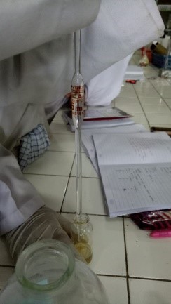 - Untuk variasi volume KMnO4 dilakukan dengan mencampurkan larutan NaOH dan glukosa dengan masing-masing volume 5 mL dalam tiga wadah.